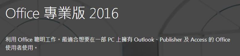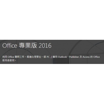 • Word 2016、Excel 2016、PowerPoint 2016OneNote 2016Outlook 2016Publisher 2016 和 Access 2016。