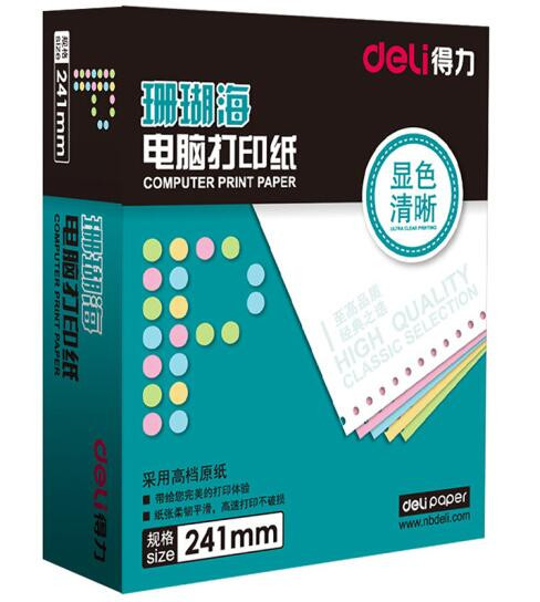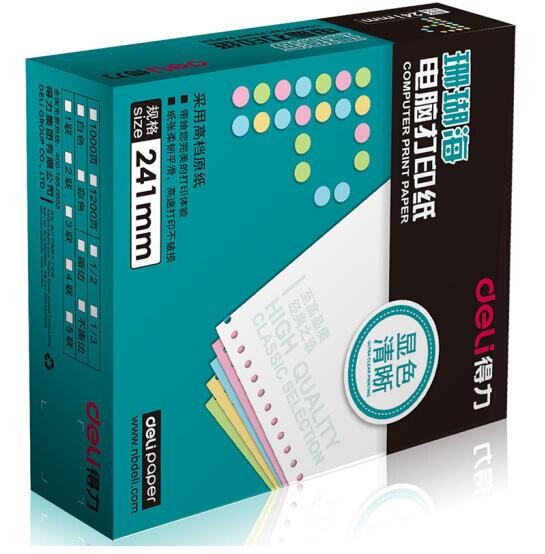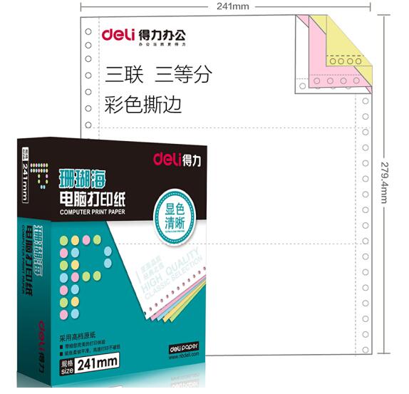 • 商品名称:得力(deli)珊瑚海彩色电脑打印纸S241-3-1/3CS三联三等分80列(撕边 色序:白红黄 1000页/箱)