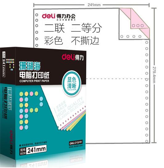 • 商品名称:得力(deli)珊瑚海彩色电脑打印纸S241-2-1/2C二层二等分80列(不撕边 色序:白红 1000页/箱)