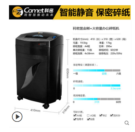 • 商品名称:科密黑金刚+ 碎纸机办公大功率快速续航60分钟长时间碎纸碎光盘